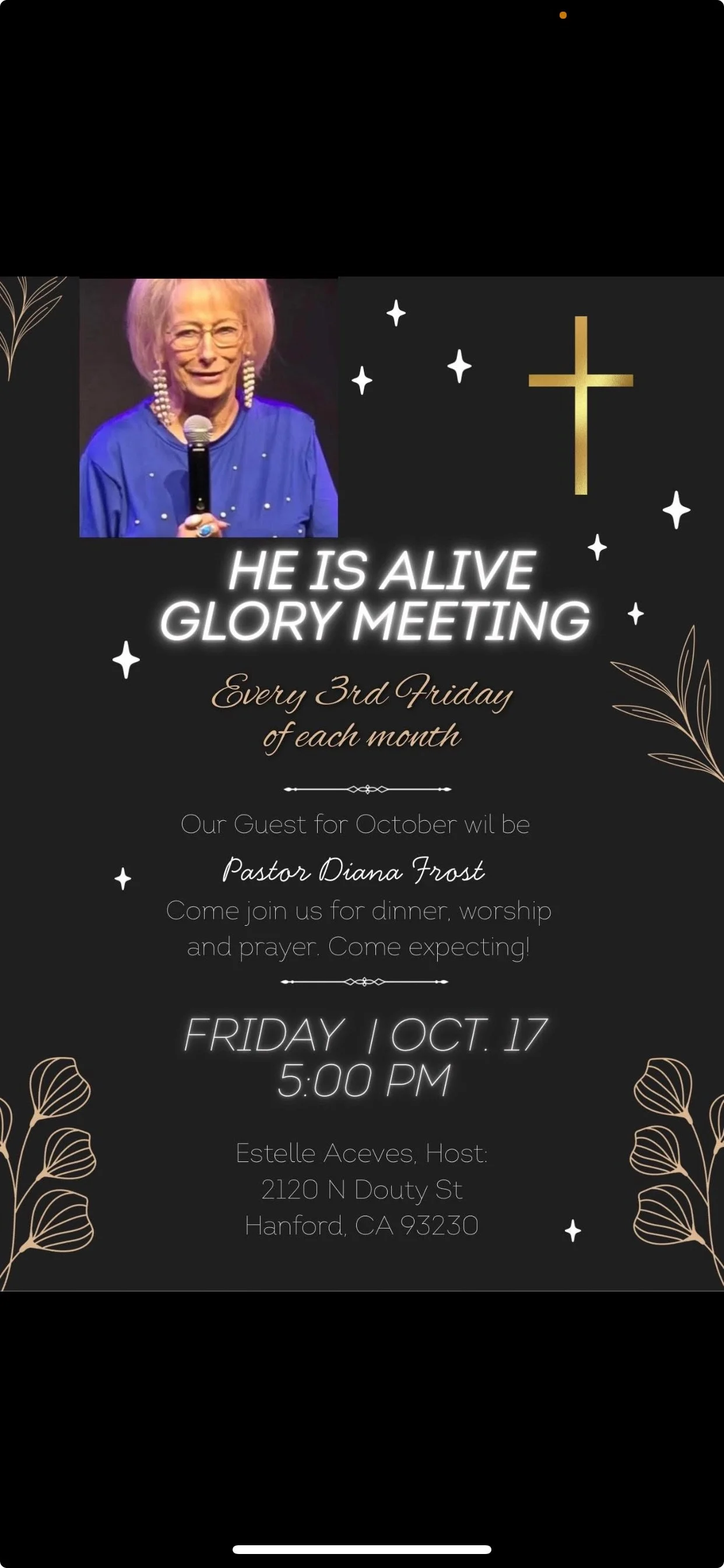 Join Pastor Diana at a monthly Glory Meeting in Hanford, CA!